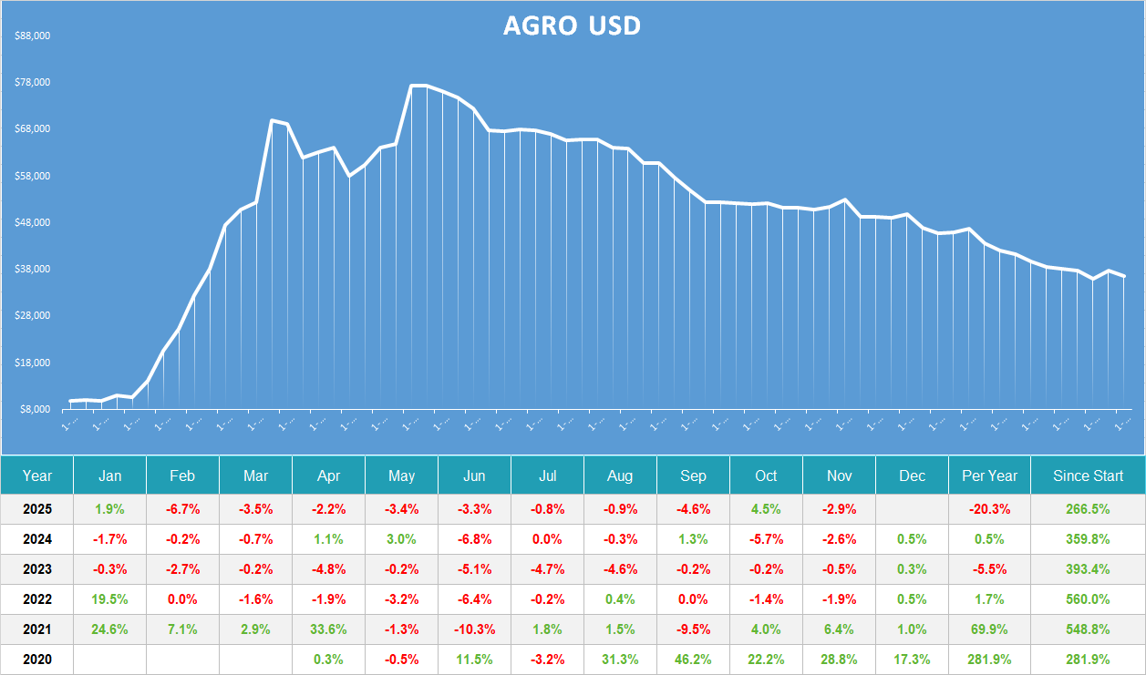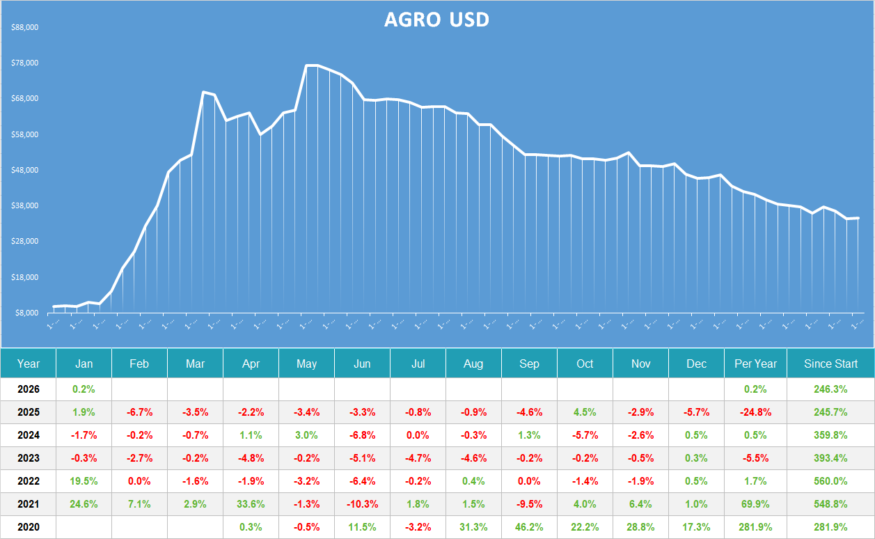 Grains tend to move independently of equities and bonds, driven instead by factors like climate, crop reports, and global food supply. Agro adds a unique layer of true diversification and real asset exposure to your portfolio—ideal for investors seeking alternatives beyond traditional asset classes.
