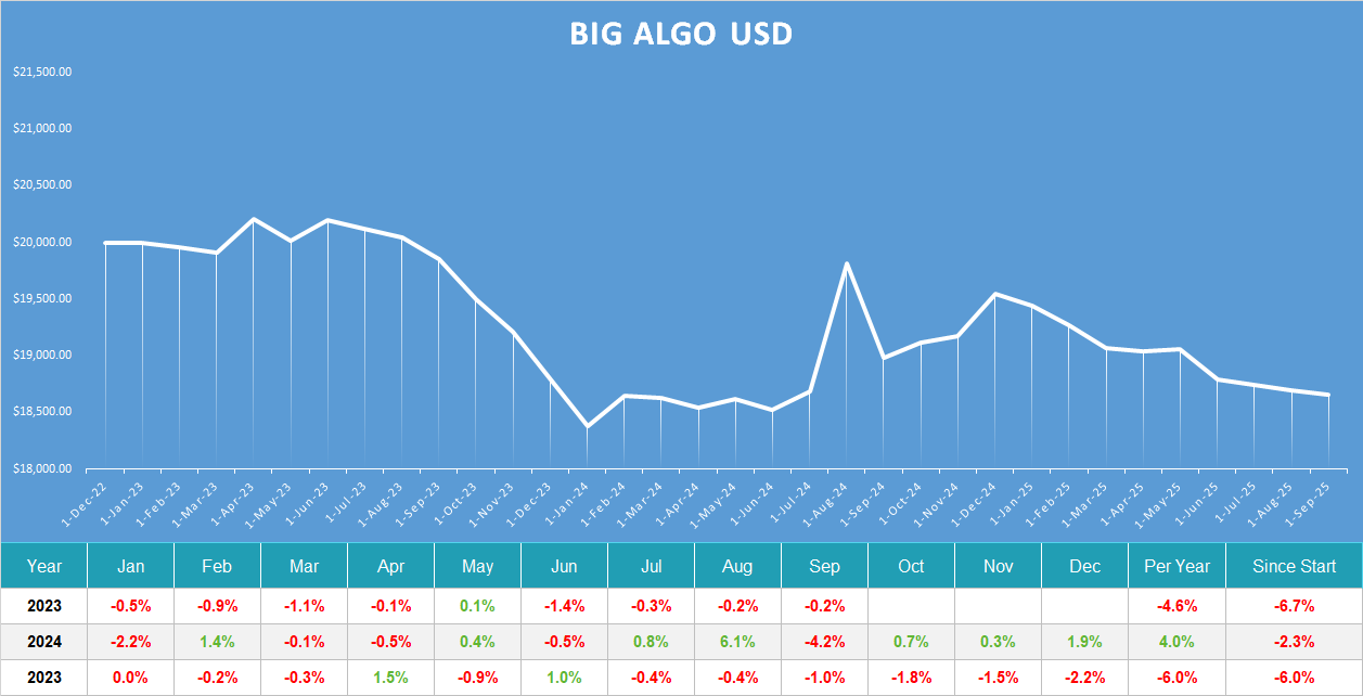To increase the robustness and smooth out the equity curve Big Algo combine as many uncorrelated algoritms as possible.
