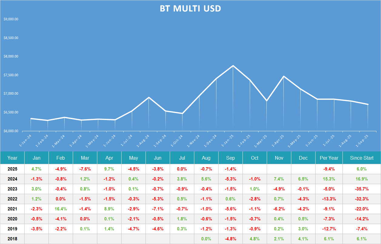BT Multi is a pattern recognition model and is not correlated to any index. The result is solely dependent on the fund managers ability to pick profitable trades.