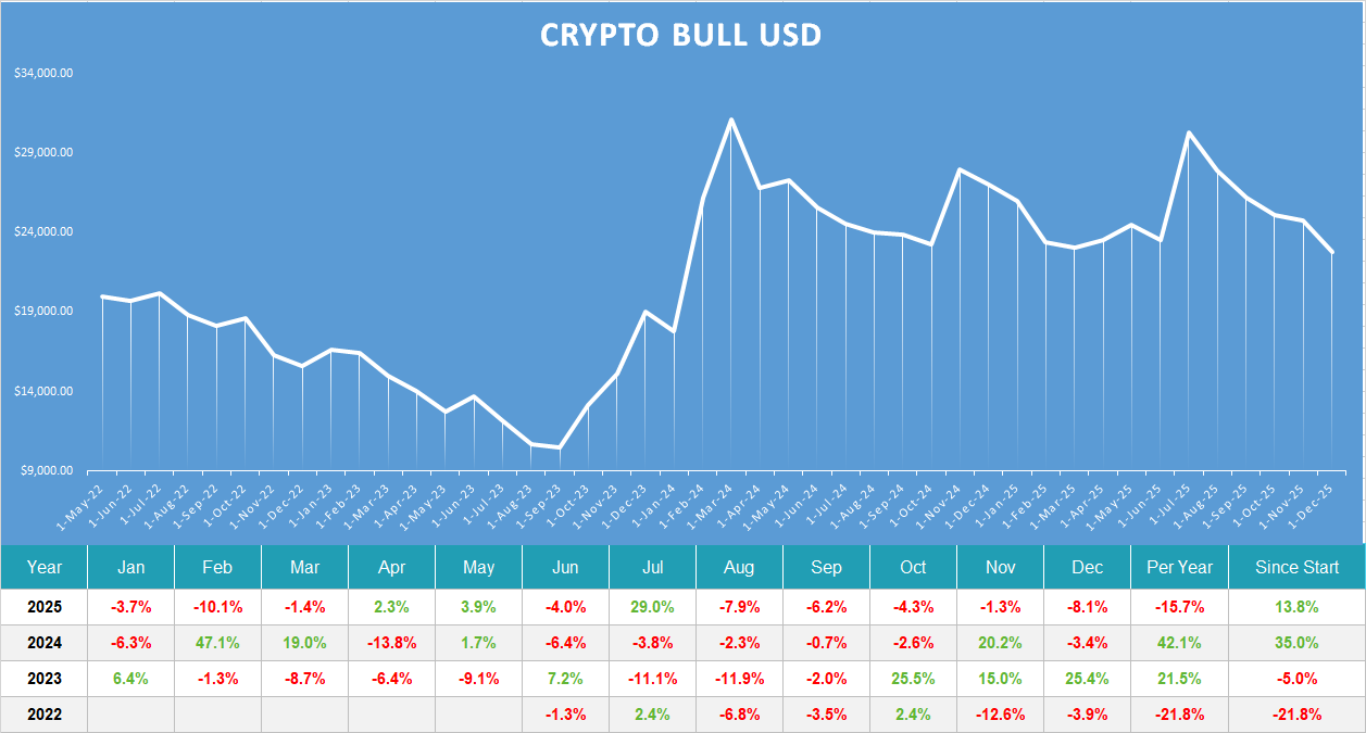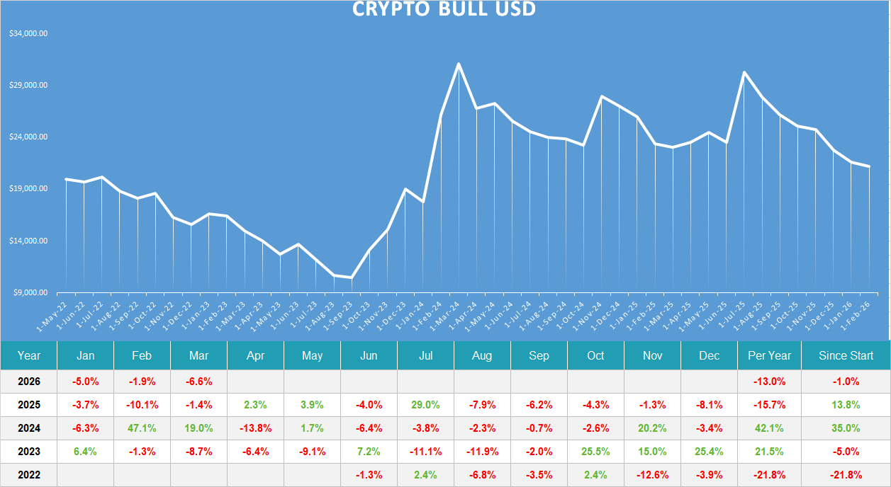 Crypto Bull provides clean, process-led exposure to altcoin trends—up and down—without committing to permanent buy-and-hold. It complements single-asset programs (e.g., BTC-only or ETH-only sleeves) and non-crypto strategies, aiming for a smoother risk-adjusted profile at the total-portfolio level.