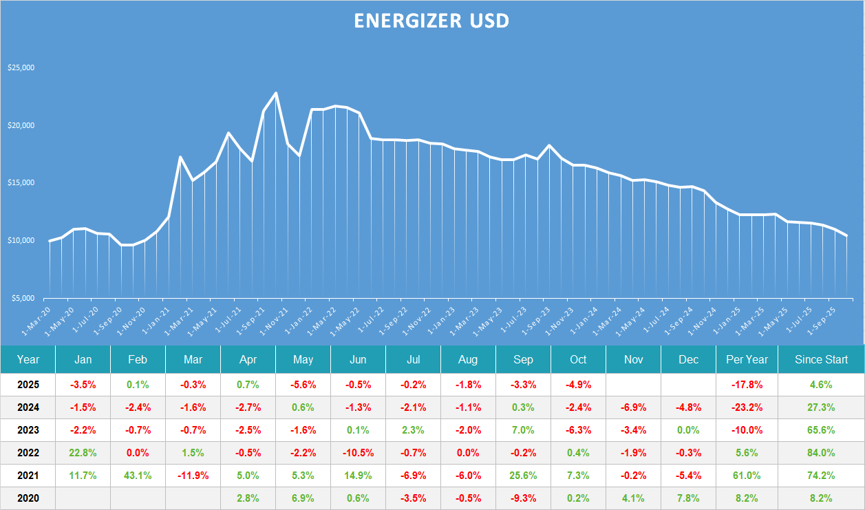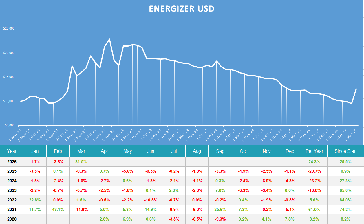 Energizer invest in energy related products and is a long only model that buys in to rising trends in different time intervalls.