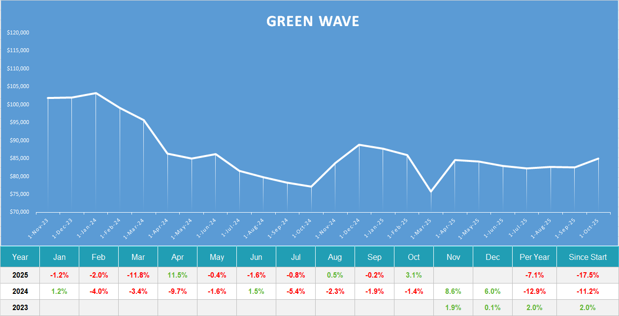 Green Wave Real Trading Green Wave program after deduction of all costs in USD Green Wave Minimum account size in Green Wave (working title: Thorp) is $89 000. Futures only.